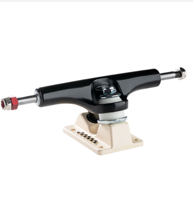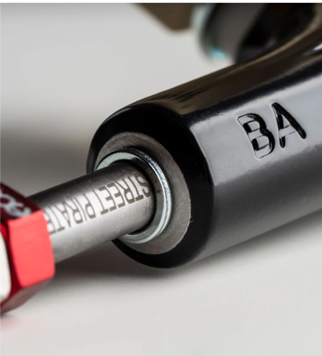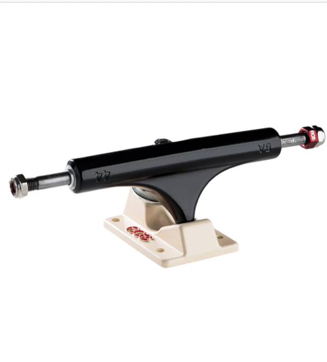 BA began by painting his standard AF1 66 trucks by hand to get the custom colorway exactly as envisioned. Take notice to the red "ACE" logo and black checkers on the baseplate, two rare touches. Looking for a slight increase in weight, and also add a unique touch, the hanger is painted cream then black, with the cream base layer revealing as the black coat is skated off. The "BA" moniker is embossed into the hanger opposite the size marking. Dubbed "Street Pirate" by Frank Gerwer, this namesake is engraved into the axle.