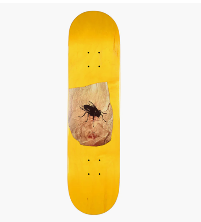 Fly Bag Yellow team skateboard deck. Width: 8". Length: 32.375". Wheel base: 14.25". Manufactured at PS Stix.