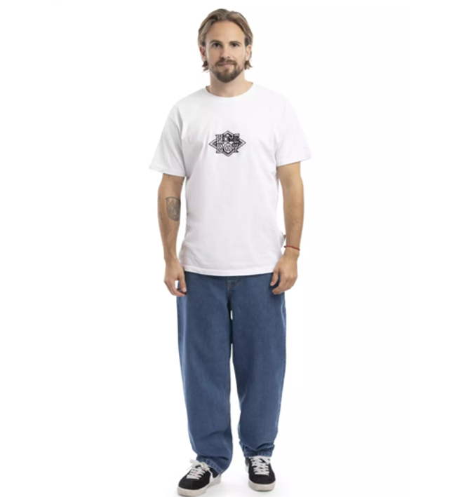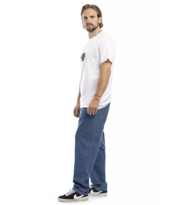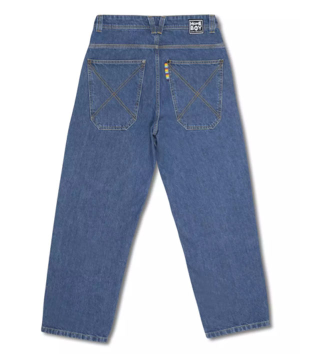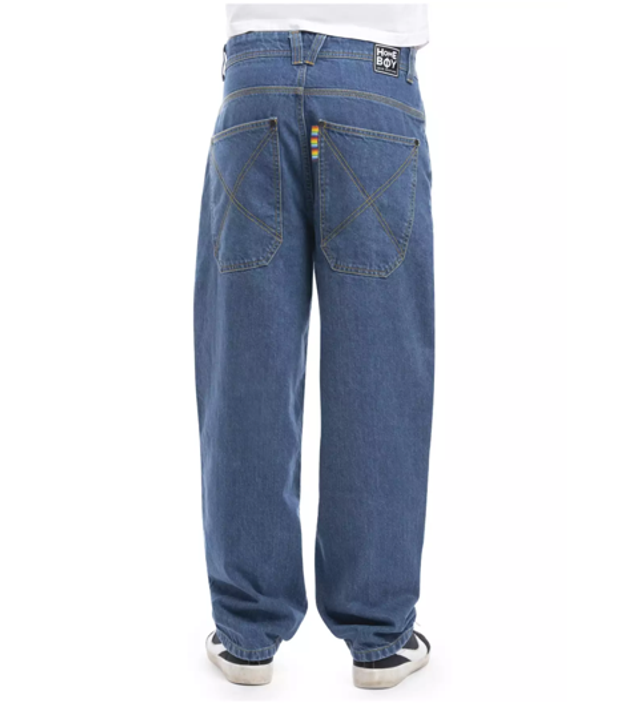 Our baggy jeans have a classic vintage look, because we took the key-details from the 90s. These include the multi-colored "homeboy x-tra" embroidery under the waistband, the Rainbow Fly-Tab and the X-embroidery on the back pocket. The back pocket is also cut a little lower, just like back then, giving the pants a loose-fit look.