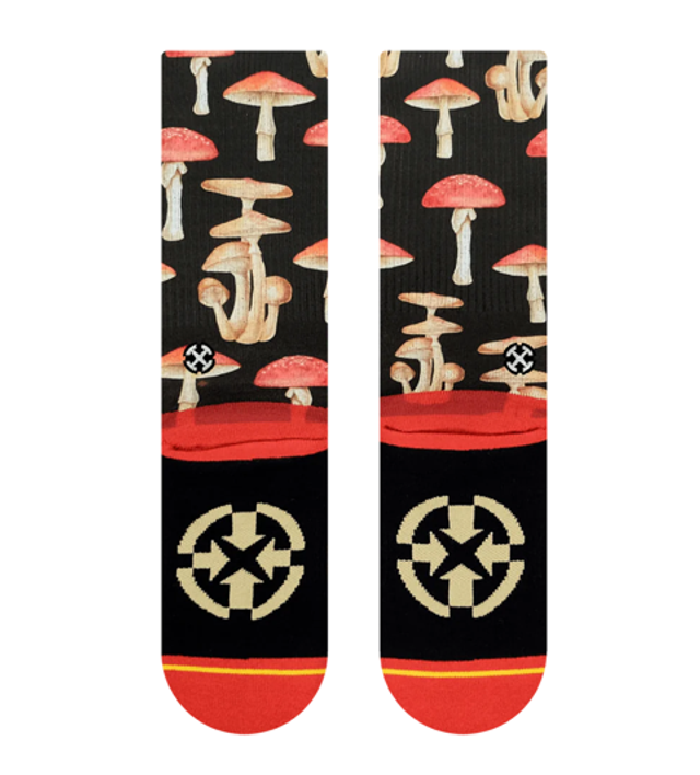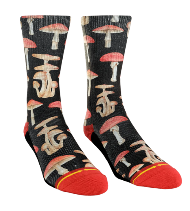 Add some fun and quirky style to your sock game with the MERGE4 compression crew socks. These socks feature a bold and playful Fungai pattern of mushrooms, art by Hanna Minck. With a reinforced Y heel pocket and seamless toe along with moisture wicking padded soles, these socks offer added durability and support, making them perfect for everyday wear.