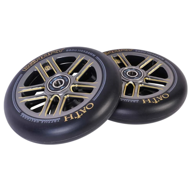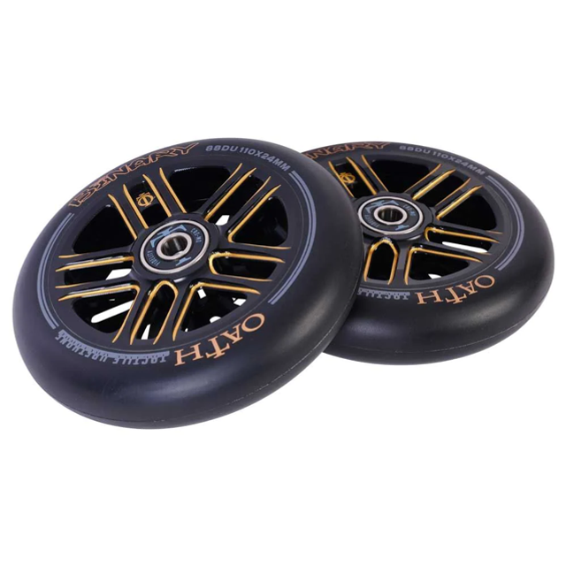 'The Oath Binary wheel is a twin star, light weight hollow core design. It has a recessed core to allow for a deeper, taller urethane that gives a plusher cushioned feel on those big drops. Fitted with our high grade Oath Fidelity bearings, with the right blend and speed and durability.